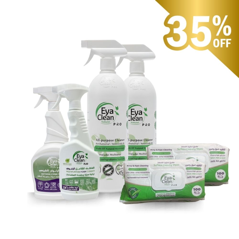 أقوى عروض التوفير من إيا كلين برو لمنتجات التنظيف بدون كيماويات. منتجات طبيعية 100% تمنحكِ نظافة عميقة، تعقيماً أكيداً، وأماناً تاماً على بشرة أطفالك ومرضى الحساسية والإكزيما.